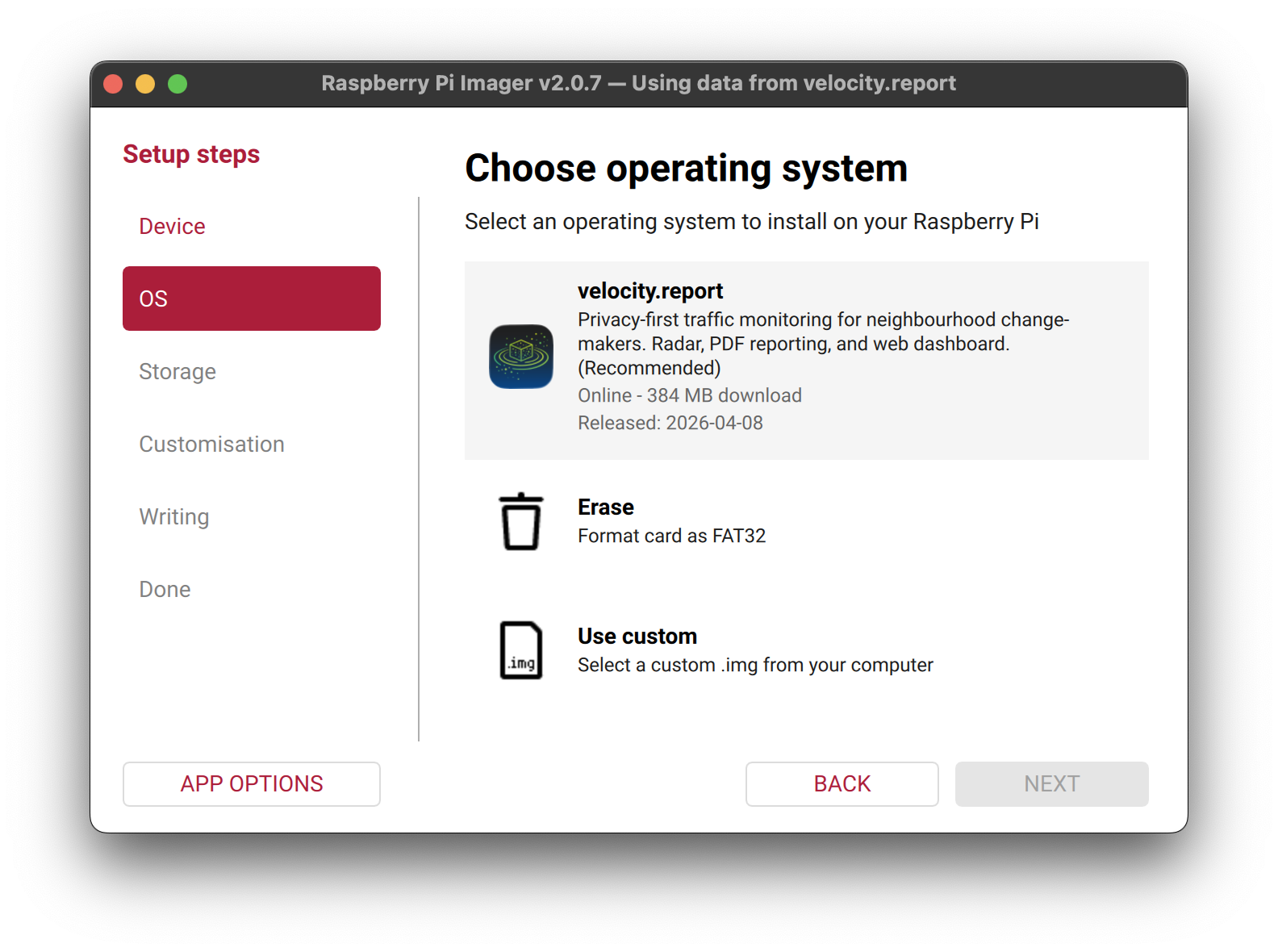 This opens Raspberry Pi Imager with the velocity.report image pre-loaded: